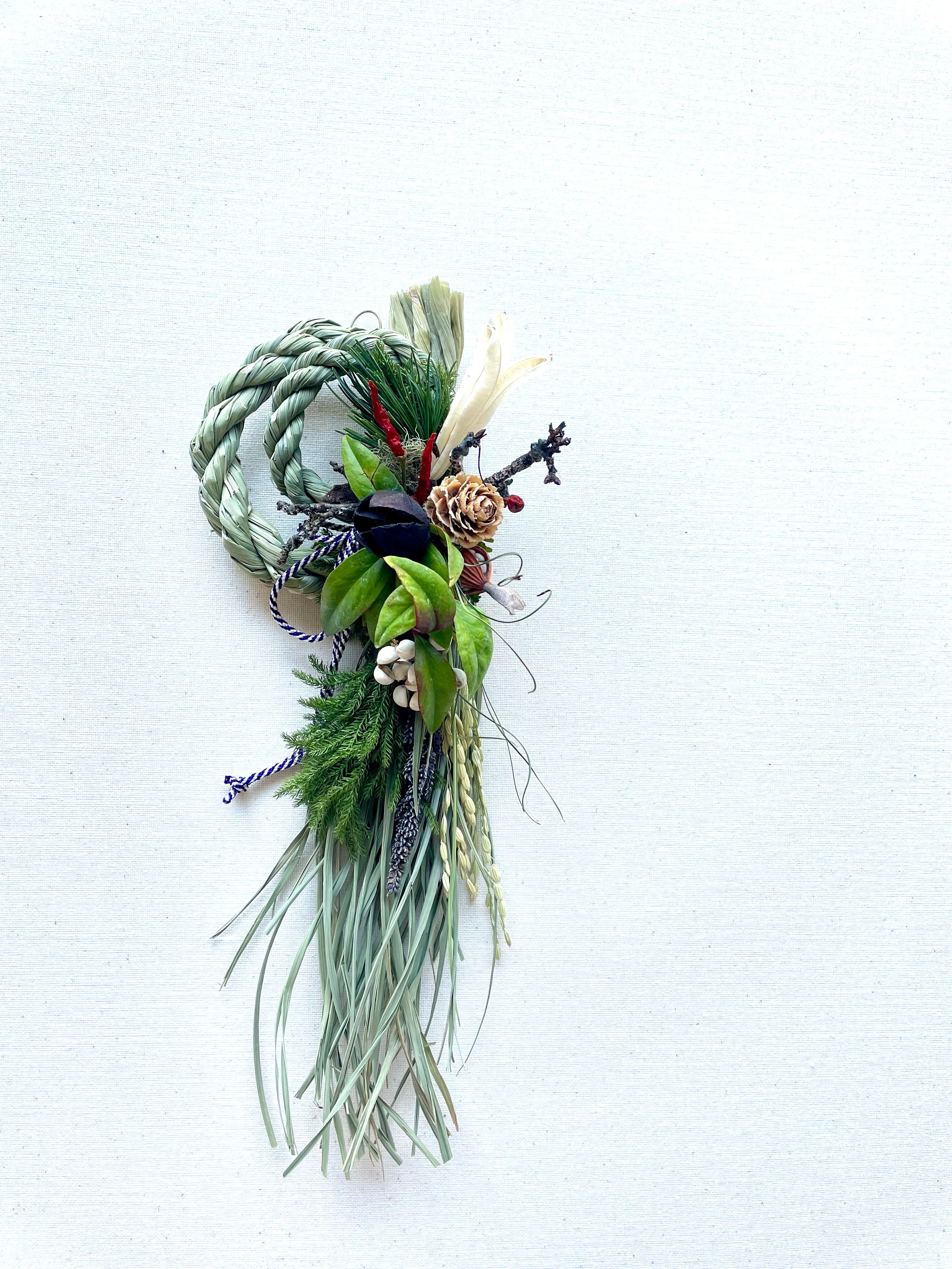 手編みの藁しめ縄に梅の苔枝、ナンキンハゼ、などを入れてお作りしました。
