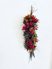 南天の赤い実と、深みのある色合いのオタフク南天の葉、黒米を合わせたお正月の壁飾りです。