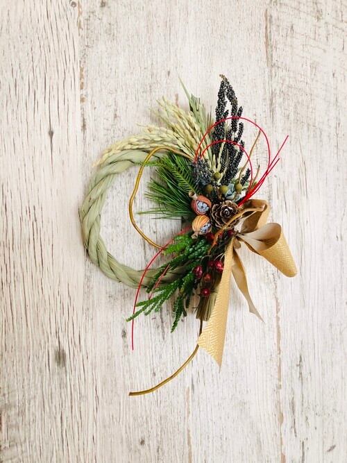 根引松のフレッシュ、稲穂、月桃の実、バラの実、松かさ、黒ひえなどドライフラワーを使用して制作致しました。