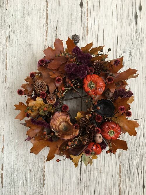 秋色ベースにパンプキン、キノコのドライを使用した秋リースになります。