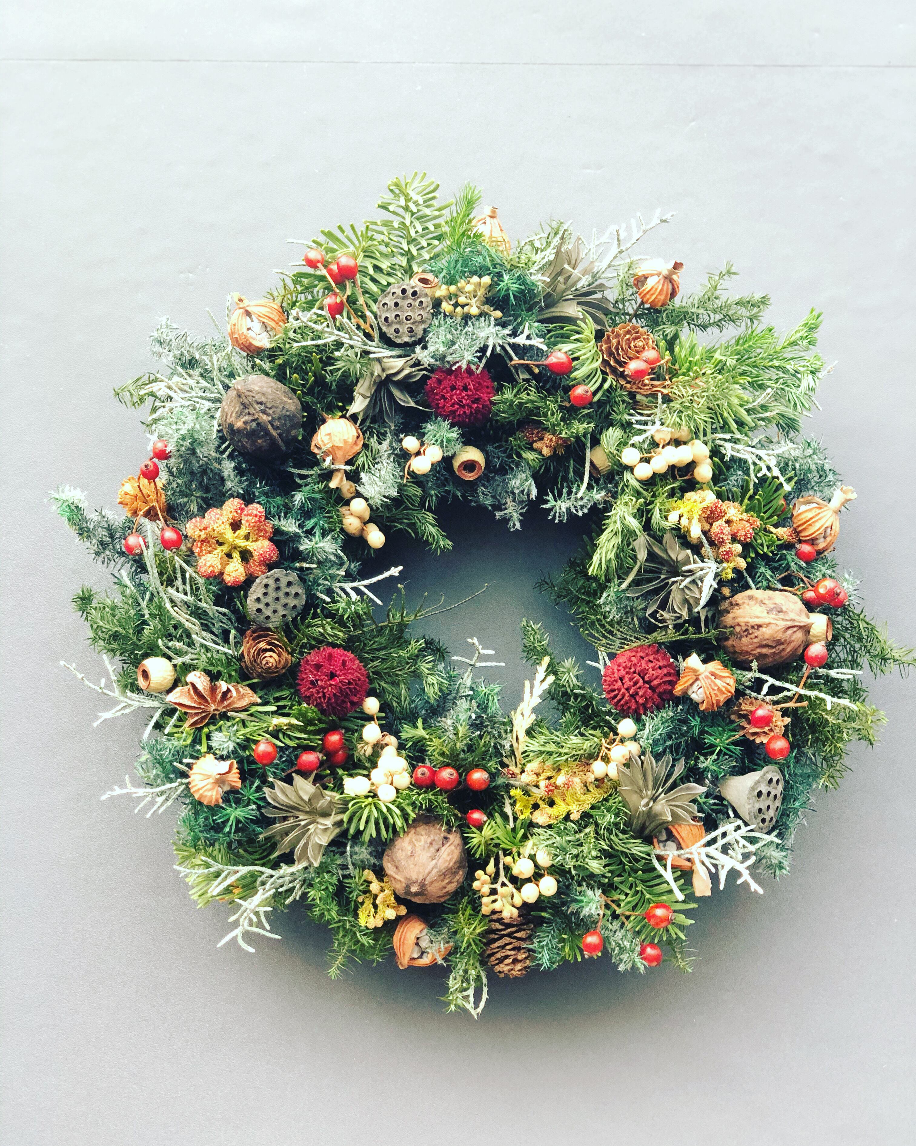 ○フレッシュの葉物、ドライフラワー、木の実、プリザーブドなどを使用したリースになります。