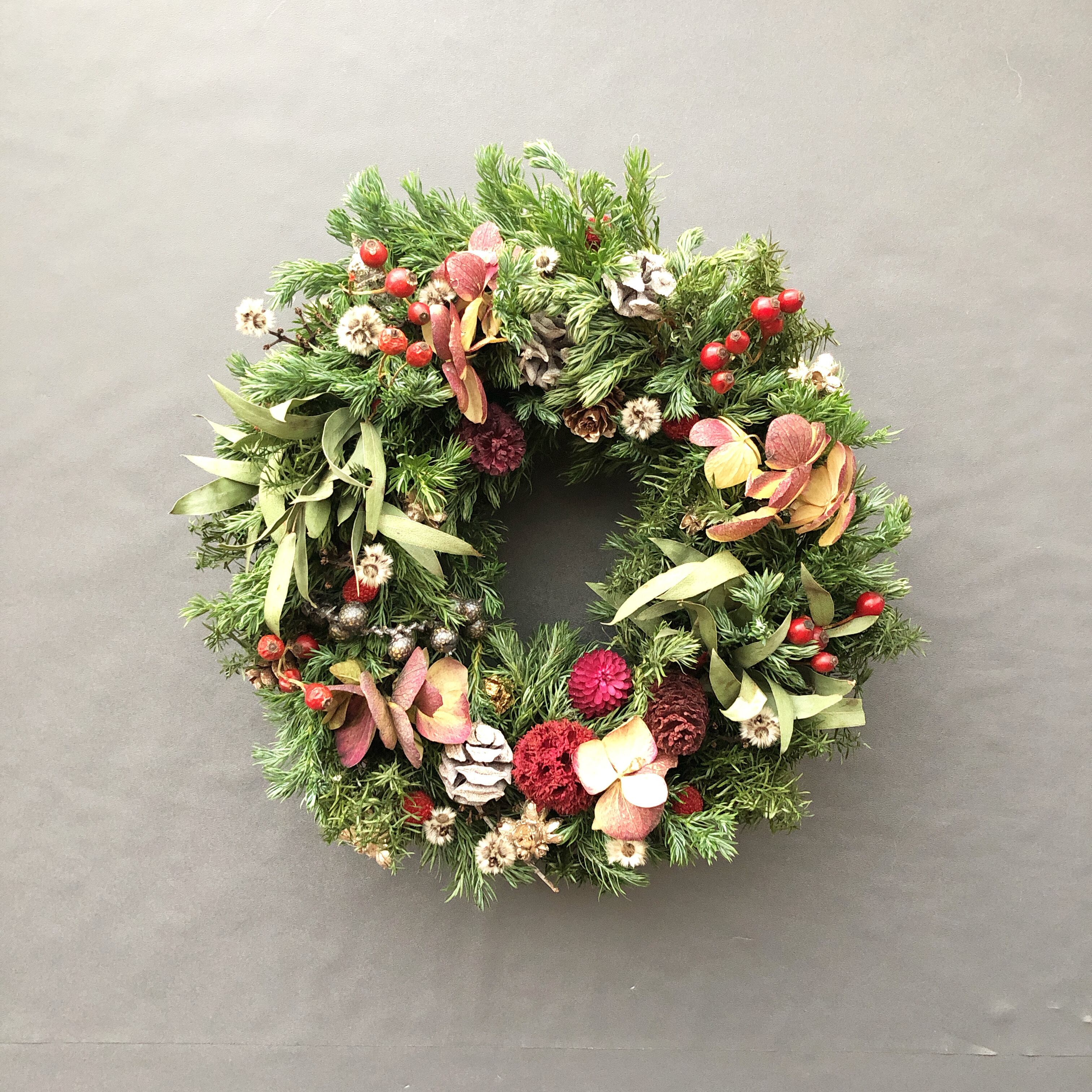*野ばらの実、紫陽花、松かさ、ユーカリetcで製作したクリスマスリースです。赤ベースで大人のリースに仕上げました⭐︎