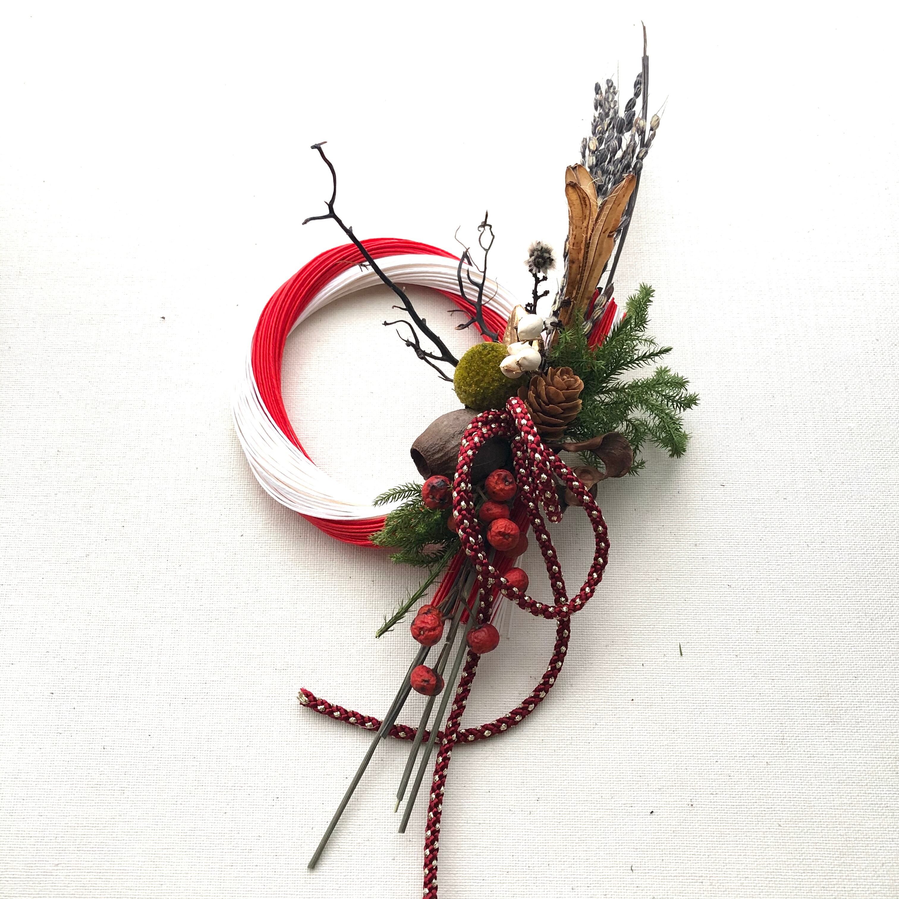 ○稲穂、海うちわ、タチカズラ、松かさ、イイギリの実などを入れて製作致しました。ちょっと変わった海の素材も使っています。