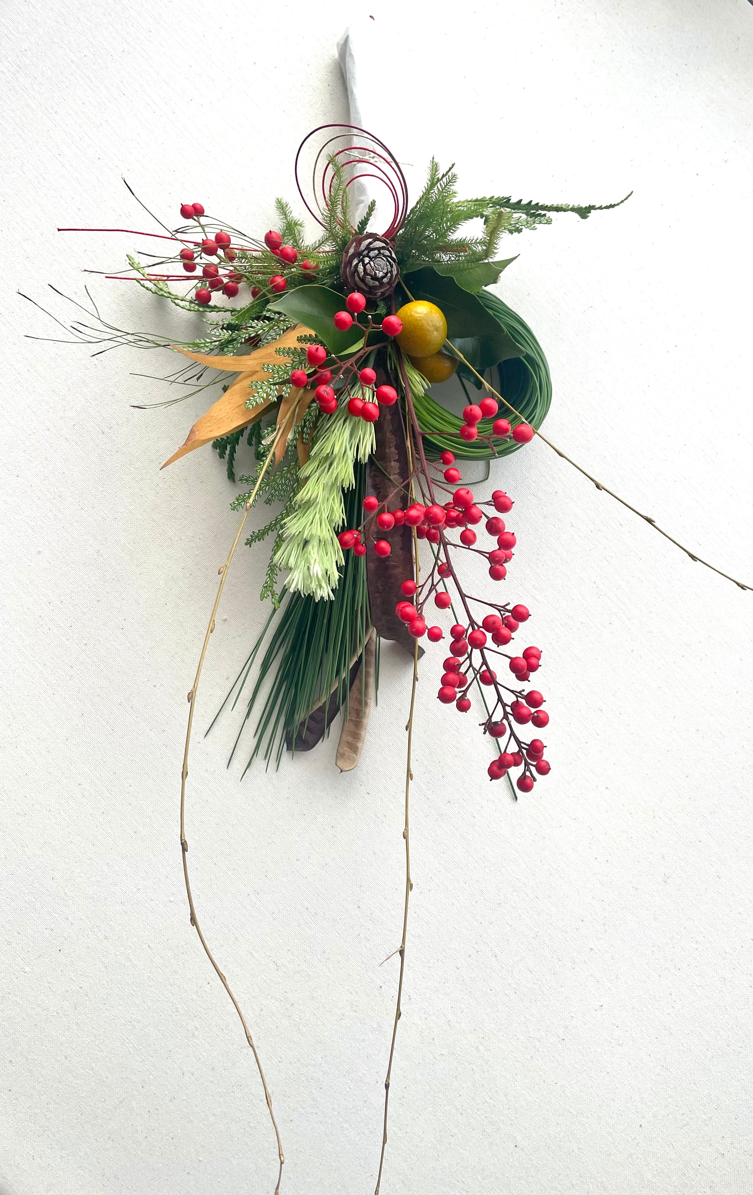大王松、南天、金柑、やなぎ、水引他で製作しています。