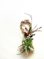 *種子島の月桃、ヒエ、ユーカリ、ヤシャブシ、ストローブ松かさ、ナンキンハゼの実、水引他で製作しました。