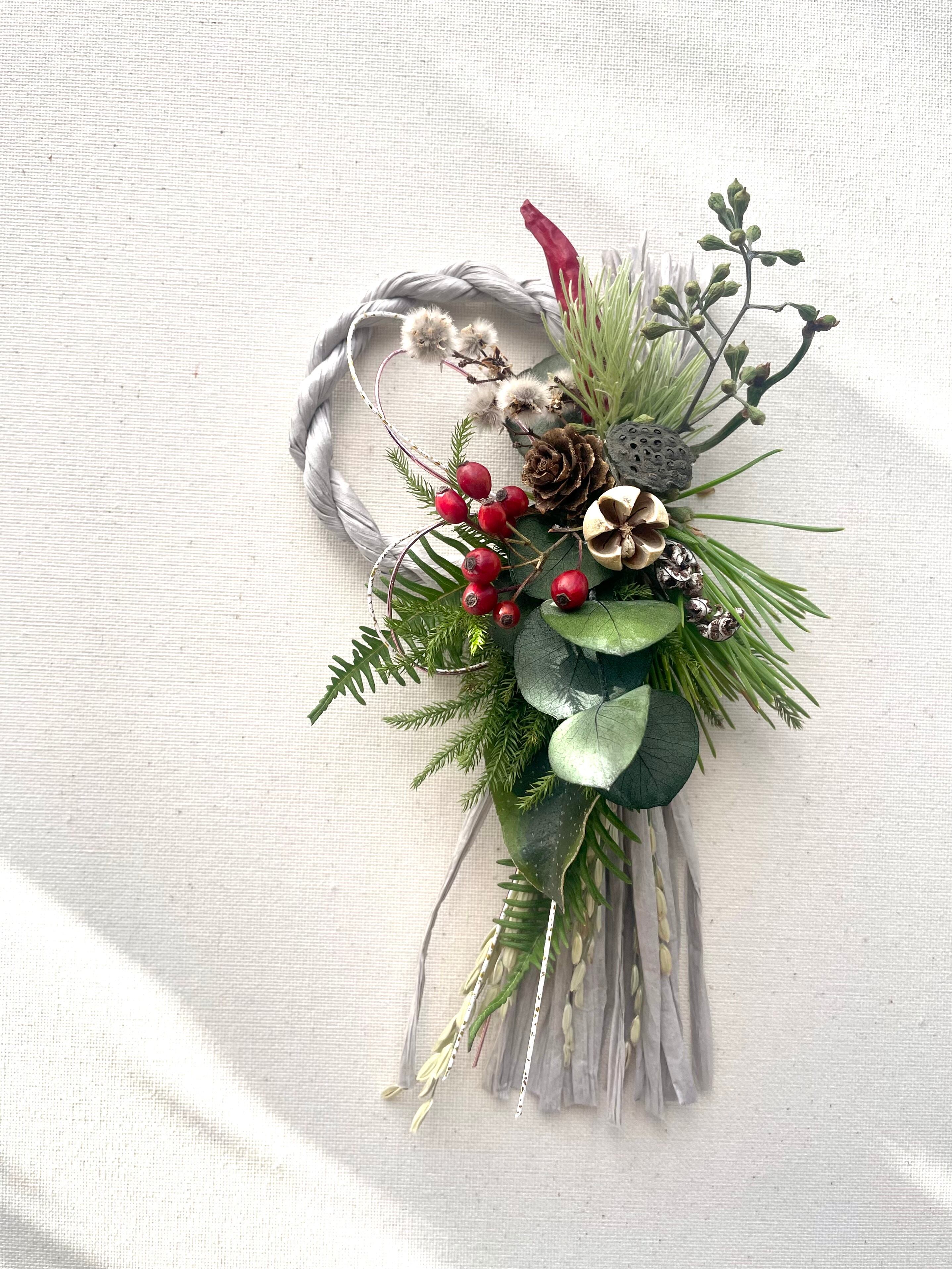 ○三光松、松笠、シダ、バラの実、唐辛子などで製作したお飾りです。
