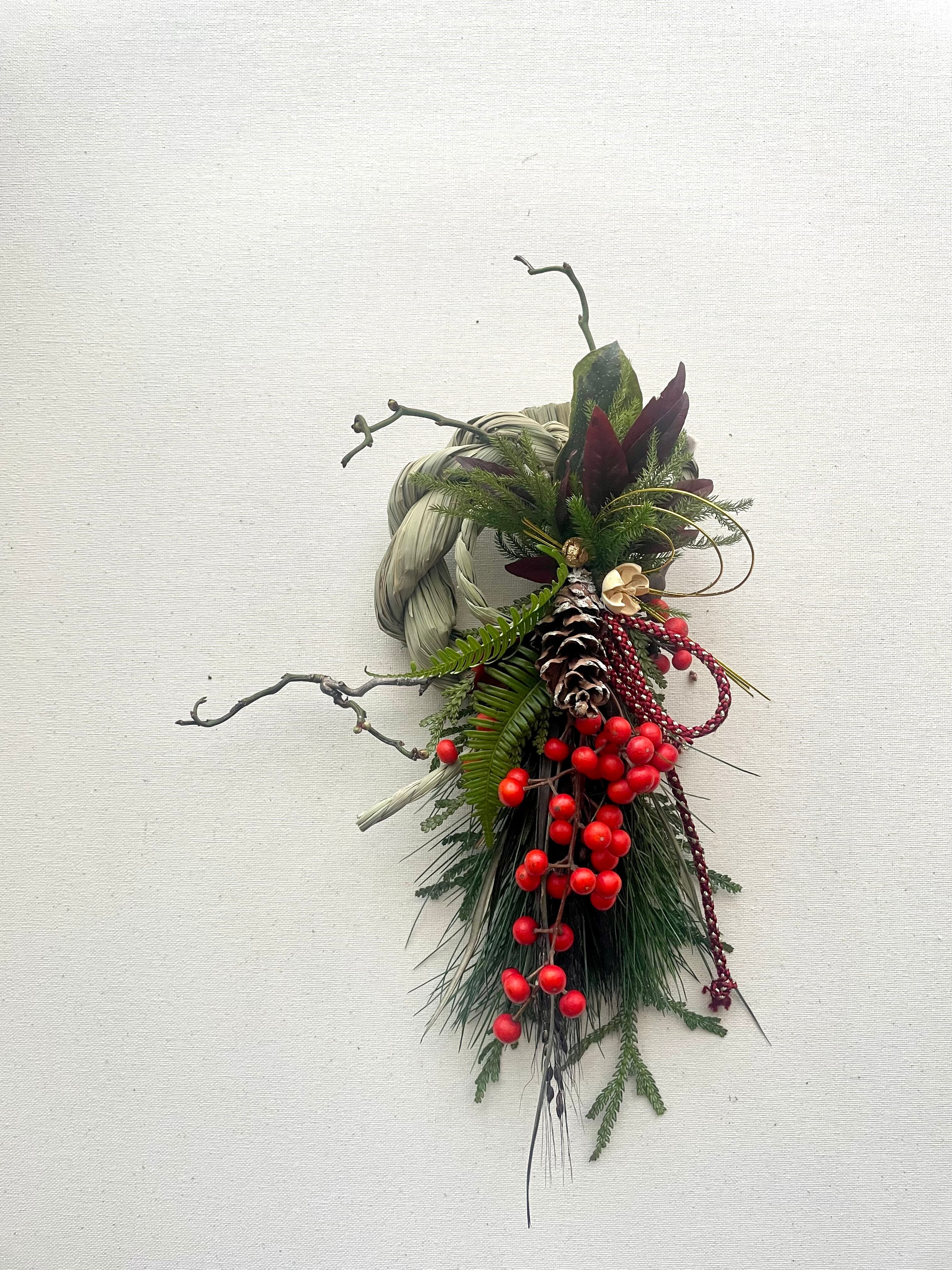 ○雲竜梅、水引、真っ赤なイイギリの実、松笠、シダ、黒米、などで製作しました。