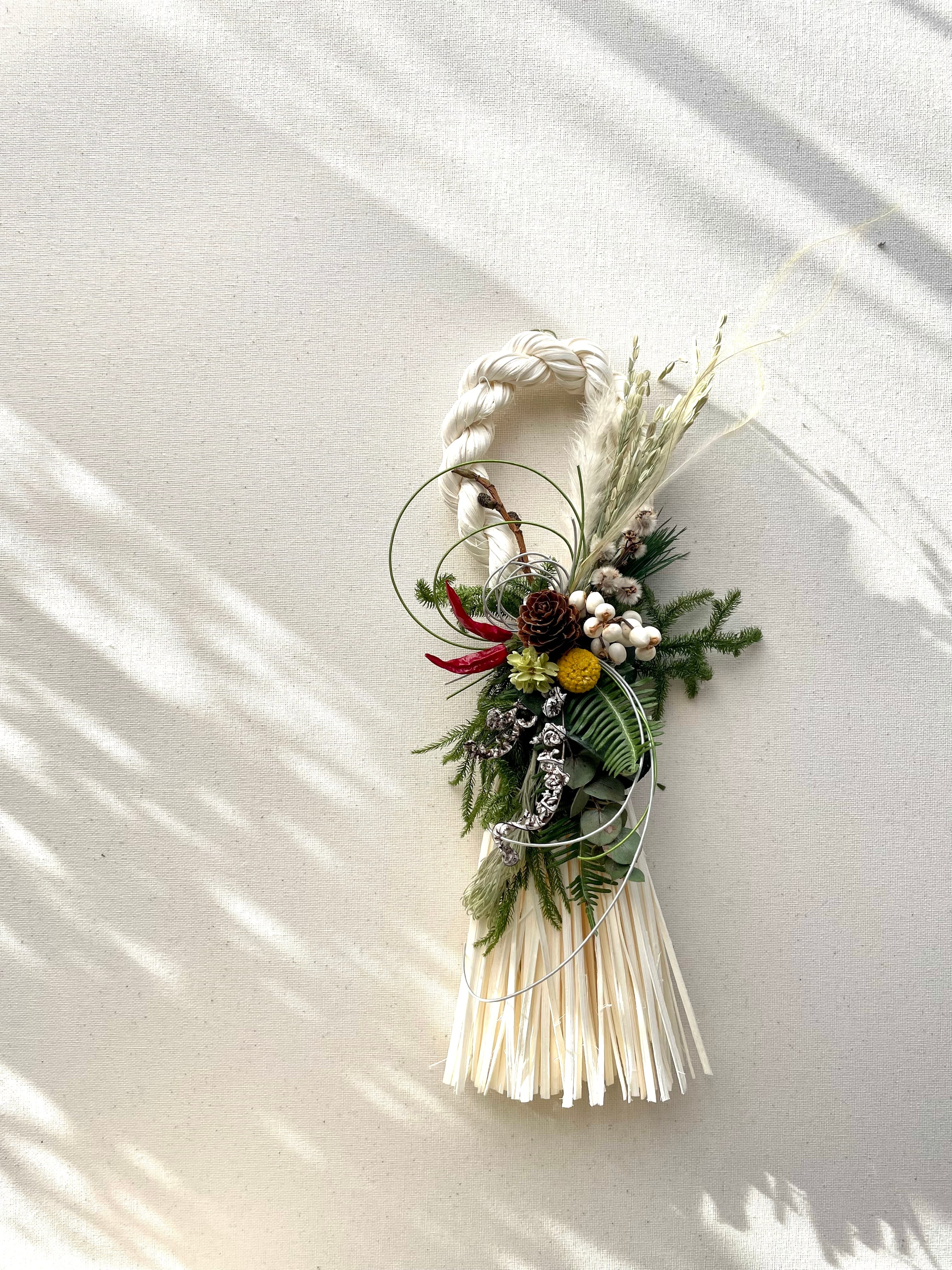 ○フレッシュの松、水引、ナンキンハゼの実、クラスペディア、稲穂、松笠、ネコヤナギ、他で製作したお正月飾りです。