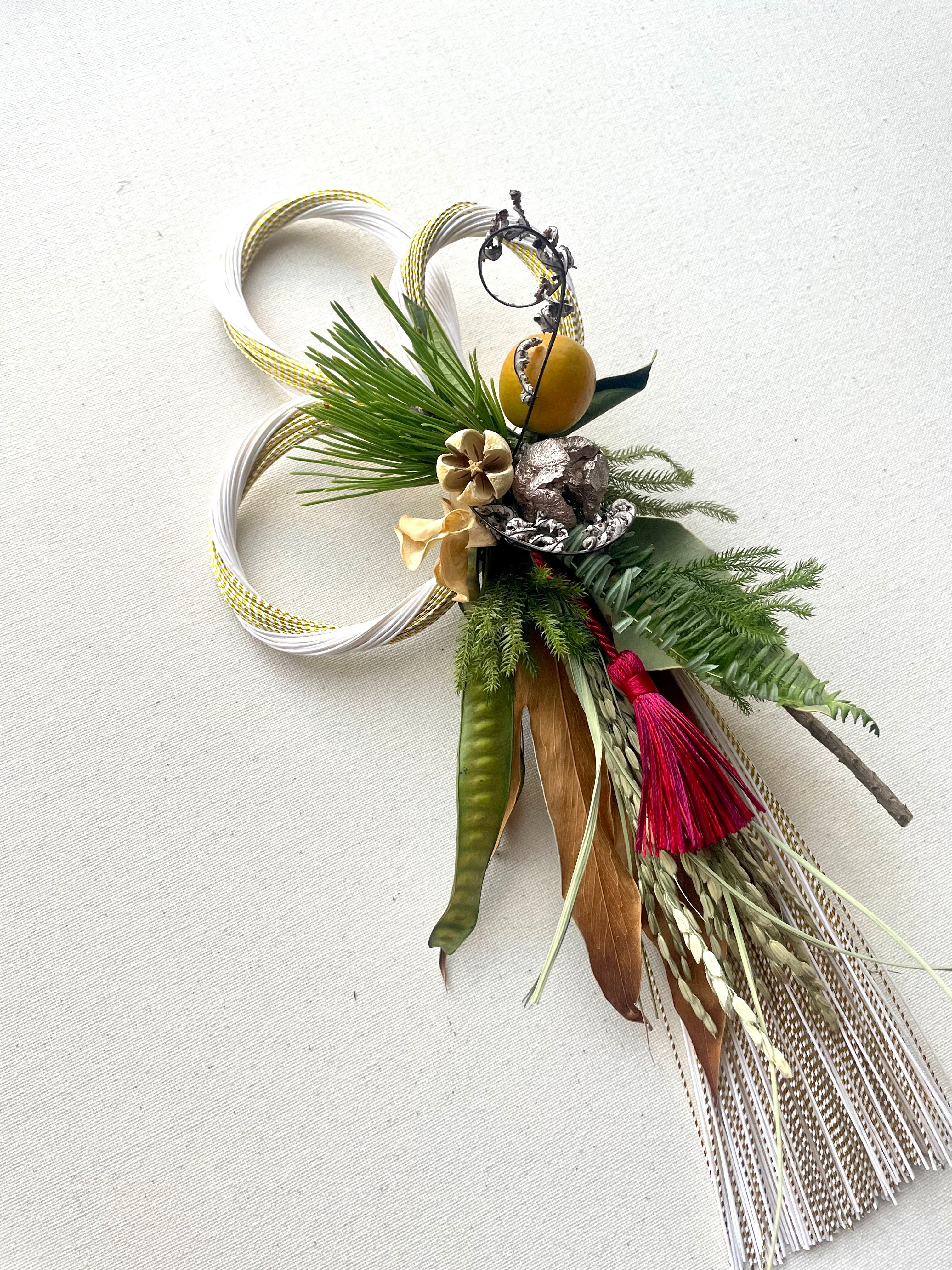 ○フレッシュの三光松、タッセル、稲穂、ギンネム他で製作したお正月飾りです。