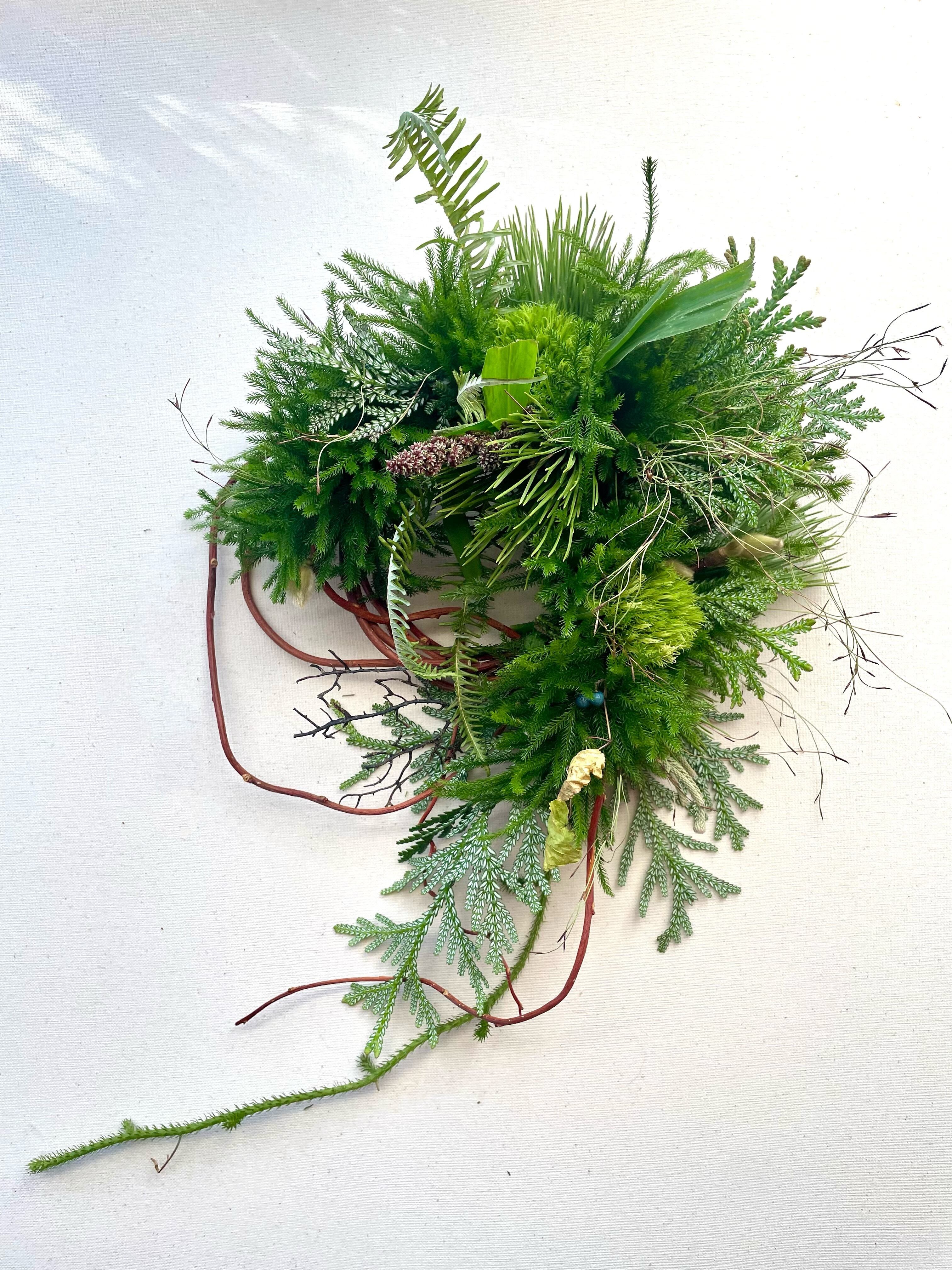 赤ヅルにタチカズラ、松、シダ、ひえ、ダイアンサス、ヒカゲノカズラ、アスナロ、海うちわを使った