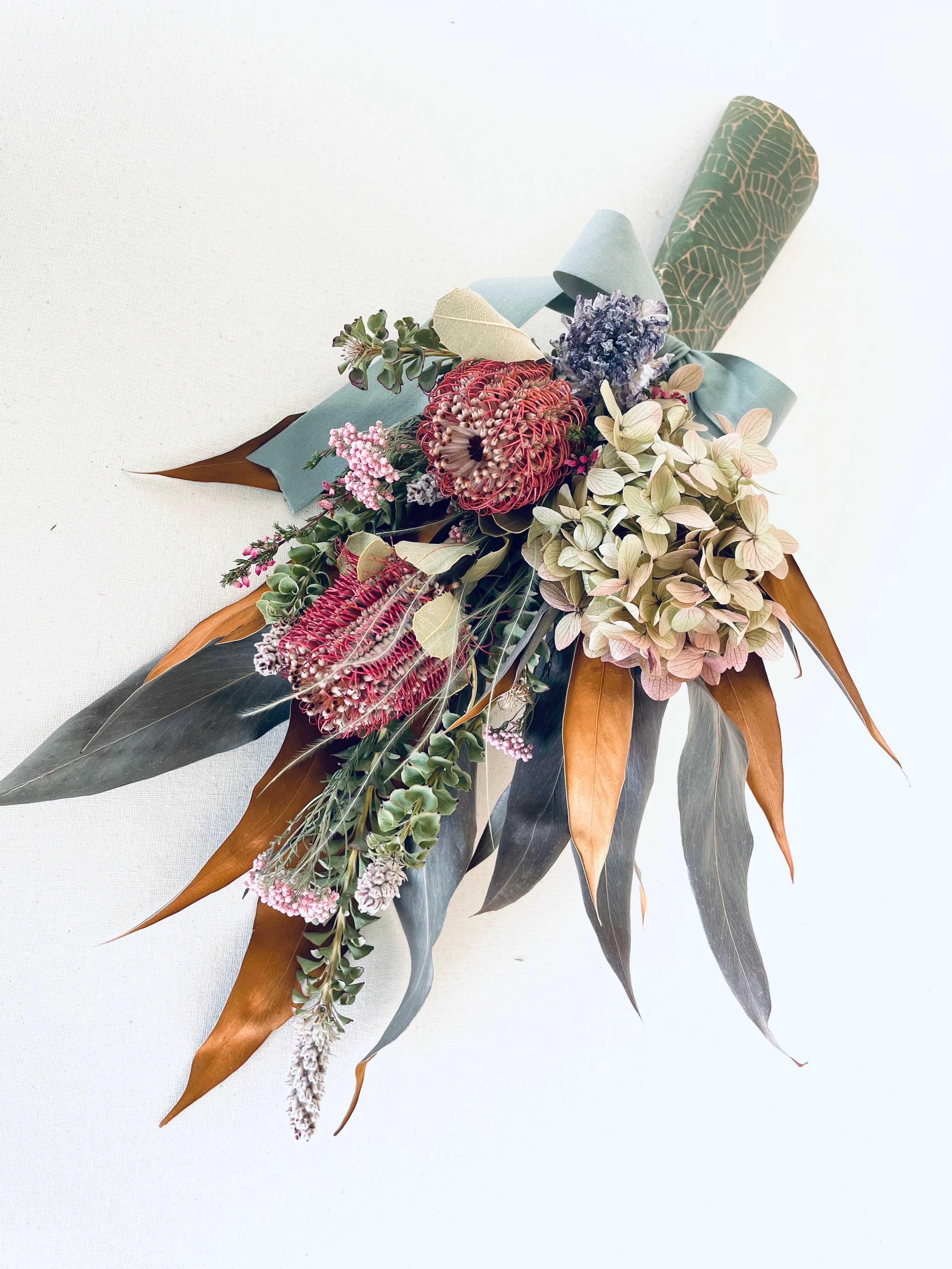 カラーはピンクを基調にし、バンクシア、グレビレア、紫陽花、ステファなどで製作しました。