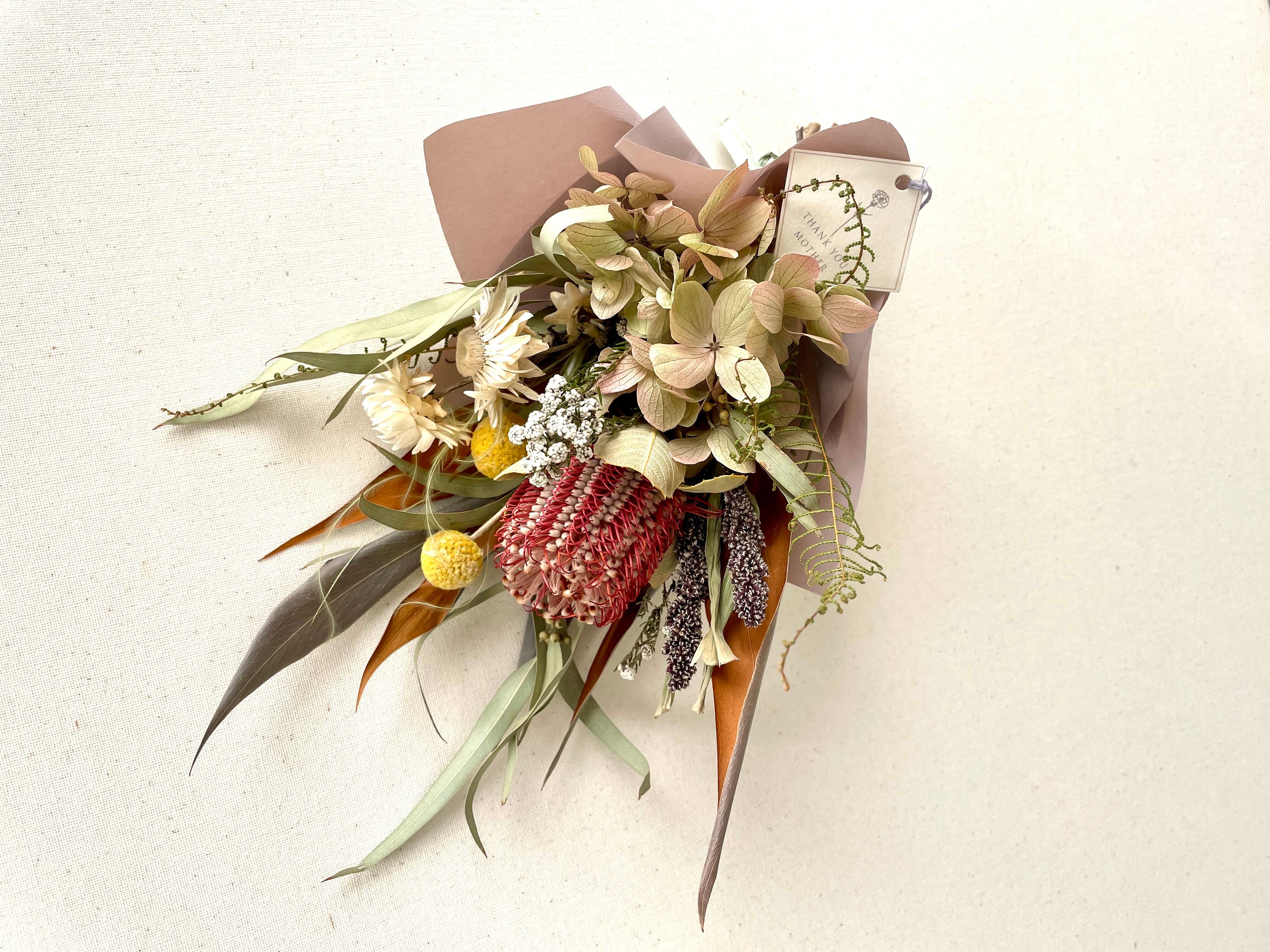 花材…①紫陽花、ユーカリ、ヘリクリサム、バンクシア、ビリーボタン、スティファ、その他