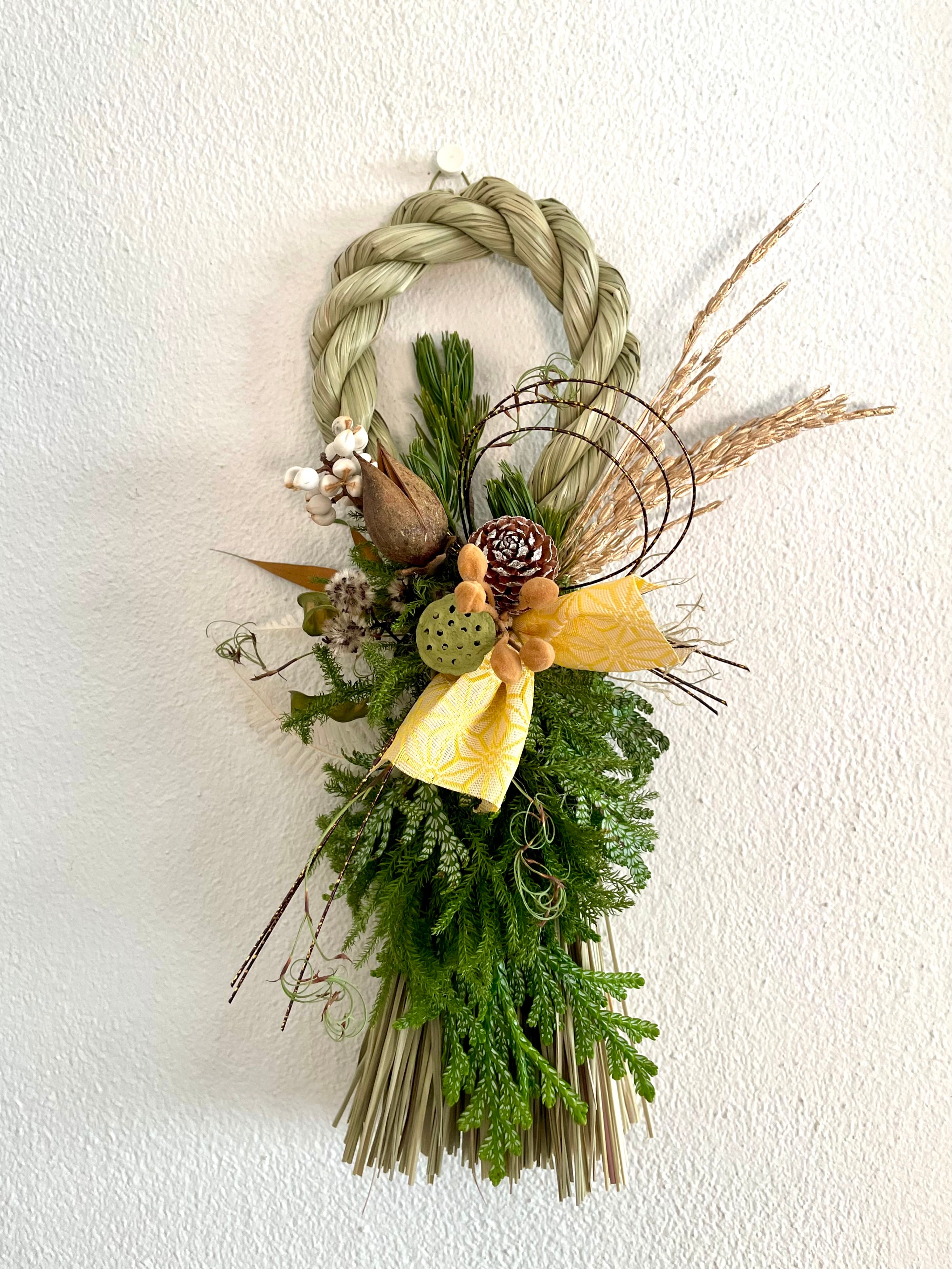 稲藁のしめ縄のグリーンなか畳リボンのイエローが効いたしめ縄飾りです。スッキリした色味です。